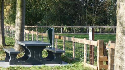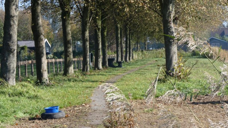 Het smalle pad tussen De Terpen en de Stoepawei langs het eetbare bos in oktober 2018 met de picknick voorziening.