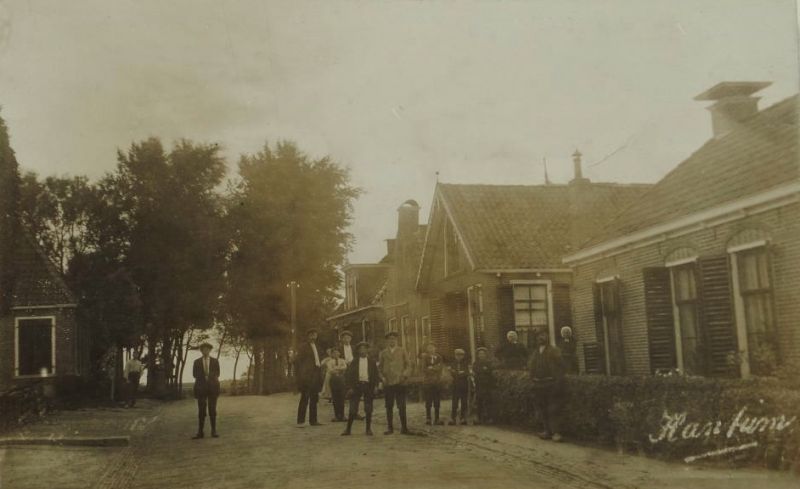 De Doarpsstrjitte in Hantum. Opschrift op bord: Rijweg Ternaard afgesloten. Rechts achterop de foto familie De Jong voor hun Sparwinkel. Linksvoor bakker Bottema en wagenmakerij Stelma met benzinepomp. Links op de foto staat de oudste zoon Piet de Jong met de kleine Waling aan de hand. Daarachter de dochter van Bouke Stelma. Foto is genomen in 1937.