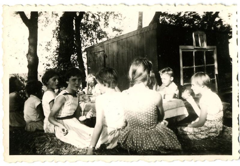 5 september 1958 verjaardagsfeest in de tuin bij het kippenhok op Stapland boerderij met vanaf links: Aukje Soepboer, Jannie Wijbenga, Durkje Hiemstra, Djoke van Gunst, Johanna de Wilde, Gerda Linthof, Baukje Sietsma, Andries Hiemstra en Ankje van den Berg.