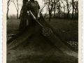 Sape van der Veen leunt tegen de cabine van de vrachtwagen waarmee Hendrik van der Veen de melkbussen vervoerde naar de Coöperatieve melkfabriek in Dokkum. Wei en karnemelk voor de kalveren, het brijbusje, boter en kaas voor de boerengezinnen werd dan weer mee terug genomen. Het gezin Van der Veen (Hendrik en Jits) woonde op 'it heechje' naast het boerderijtje van Jan Kamstra. (Het huis is gesloopt, it heechje is er nog, onderdeel van een stuk weiland van Sjoerd Posthumus.)