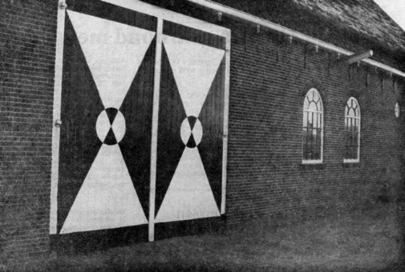 De karakteristieke zandloper op de schuurdeuren van boerderij Popta state.